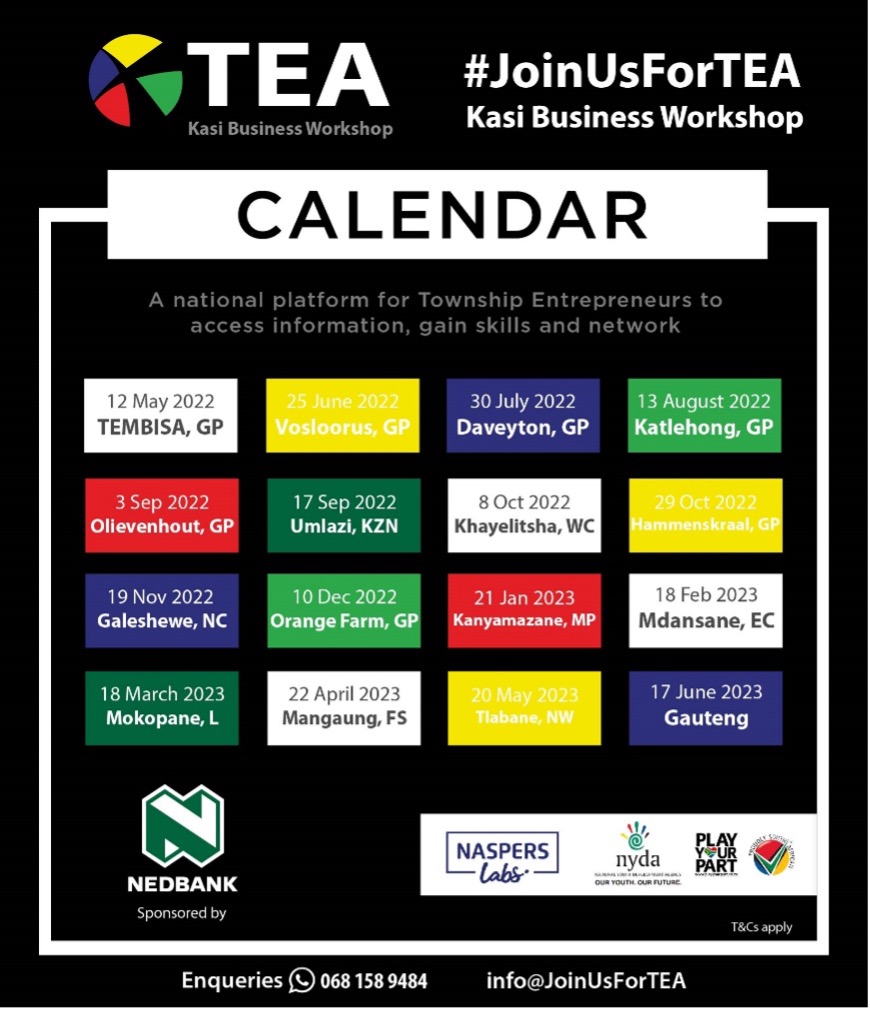 The Township Entrepreneurs Alliance want you to join them for tea, while you connect, develop and grow! The FREE workshops are facilitated by experienced and successful township business owners who understand the challenges associated with establishing and growing a township business.